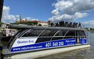 Katamaran Queen Eva może pomieścić do 47 osób, cumuje przy przystani „Wiślany Ogród” (obok Mostu Dębnickiego, vis a vis Hotelu Sheraton).